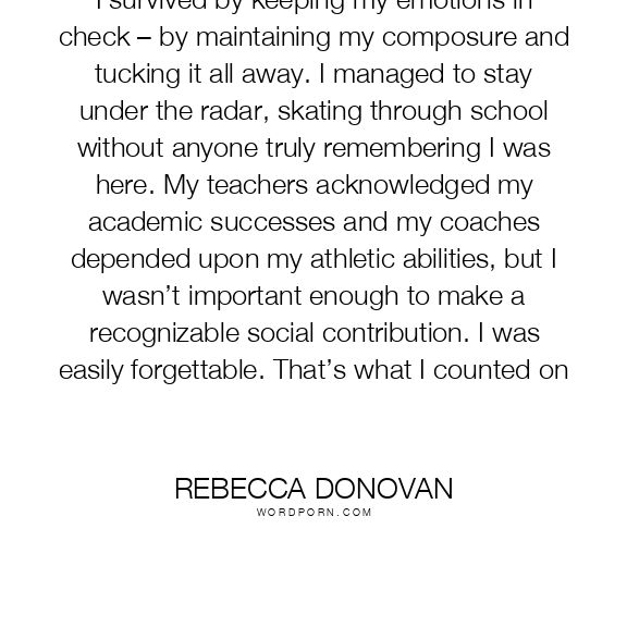 I survived by keeping my emotions in check – by maintaining my composure and tucking it all away. I managed to stay under the radar, skating through school without anyone truly remembering I was here. My teachers acknowledged my academic successes and my coaches depended upon my athletic abilities, but I wasn’t important enough to make a recognizable social contribution. I was easily forgettable. That’s what I counted on