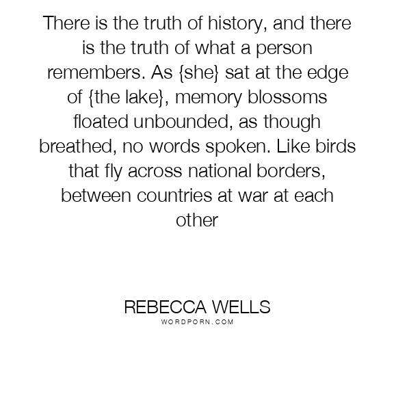 There is the truth of history, and there is the truth of what a person remembers. As {she} sat at the edge of {the lake}, memory blossoms floated unbounded, as though breathed, no words spoken. Like birds that fly across national borders, between countries at war at each other