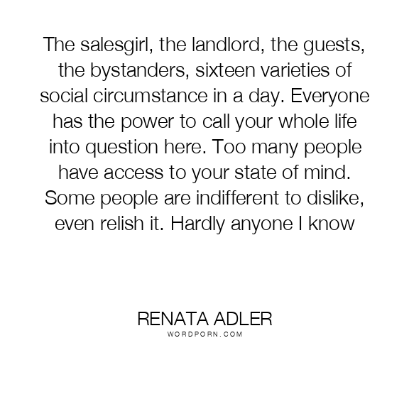 The salesgirl, the landlord, the guests, the bystanders, sixteen varieties of social circumstance in a day. Everyone has the power to call your whole life into question here. Too many people have access to your state of mind. Some people are indifferent to dislike, even relish it. Hardly anyone I know