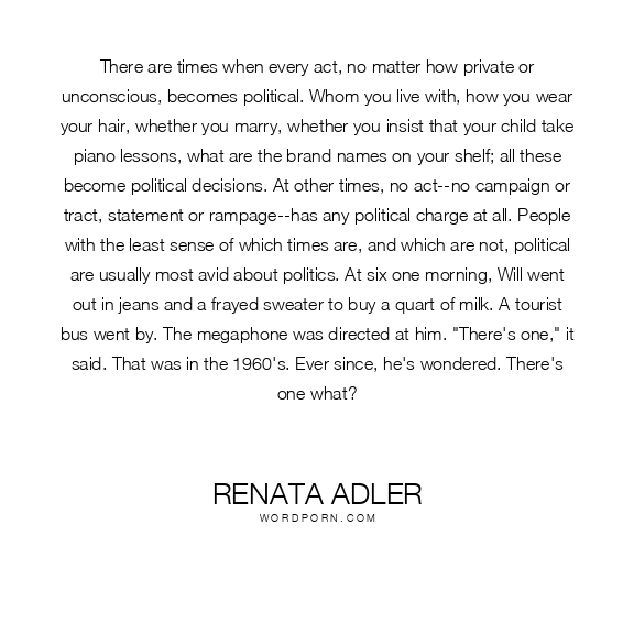 There are times when every act, no matter how private or unconscious, becomes political. Whom you live with, how you wear your hair, whether you marry, whether you insist that your child take piano lessons, what are the brand names on your shelf; all these become political decisions. At other times, no act--no campaign or tract, statement or rampage--has any political charge at all. People with the least sense of which times are, and which are not, political are usually most avid about politics. At six one morning, Will went out in jeans and a frayed sweater to buy a quart of milk. A tourist bus went by. The megaphone was directed at him. "There's one," it said. That was in the 1960's. Ever since, he's wondered. There's one what?