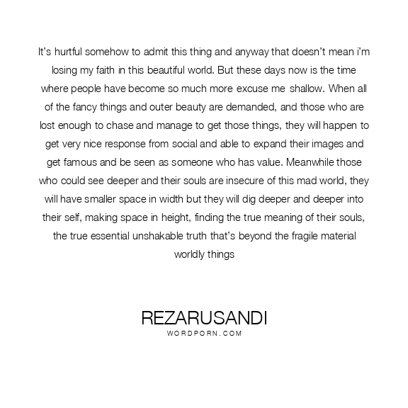 It’s hurtful somehow to admit this thing and anyway that doesn’t mean i’m losing my faith in this beautiful world. But these days now is the time where people have become so much more-excuse me-shallow. When all of the fancy things and outer beauty are demanded, and those who are lost enough to chase and manage to get those things, they will happen to get very nice response from social and able to expand their images and get famous and be seen as someone who has value. Meanwhile those who could see deeper and their souls are insecure of this mad world, they will have smaller space in width but they will dig deeper and deeper into their self, making space in height, finding the true meaning of their souls, the true essential unshakable truth that’s beyond the fragile material worldly things