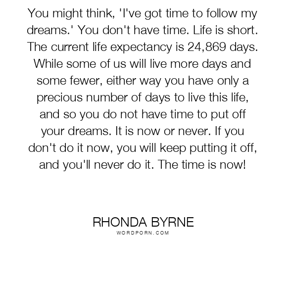 You might think, 'I've got time to follow my dreams.' You don't have time. Life is short. The current life expectancy is 24,869 days. While some of us will live more days and some fewer, either way you have only a precious number of days to live this life, and so you do not have time to put off your dreams. It is now or never. If you don't do it now, you will keep putting it off, and you'll never do it. The time is now!