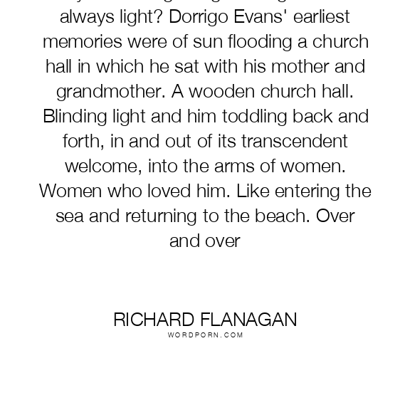 Why at the beginning of things is there always light? Dorrigo Evans' earliest memories were of sun flooding a church hall in which he sat with his mother and grandmother. A wooden church hall. Blinding light and him toddling back and forth, in and out of its transcendent welcome, into the arms of women. Women who loved him. Like entering the sea and returning to the beach. Over and over