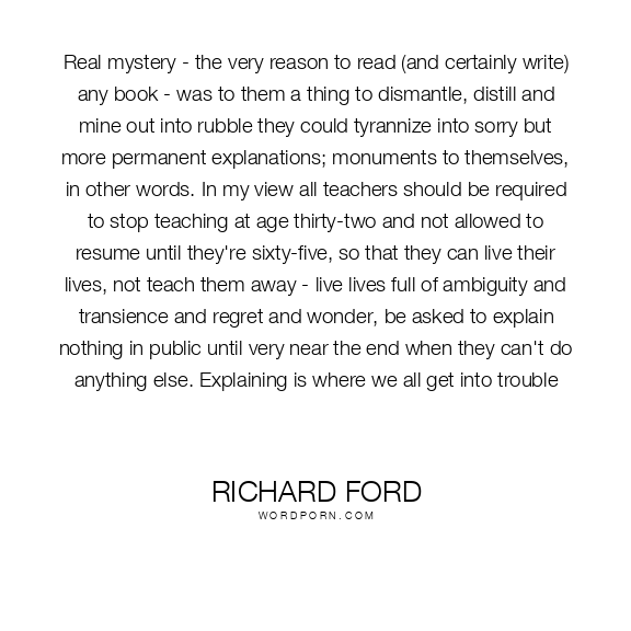Real mystery - the very reason to read (and certainly write) any book - was to them a thing to dismantle, distill and mine out into rubble they could tyrannize into sorry but more permanent explanations; monuments to themselves, in other words. In my view all teachers should be required to stop teaching at age thirty-two and not allowed to resume until they're sixty-five, so that they can live their lives, not teach them away - live lives full of ambiguity and transience and regret and wonder, be asked to explain nothing in public until very near the end when they can't do anything else. Explaining is where we all get into trouble