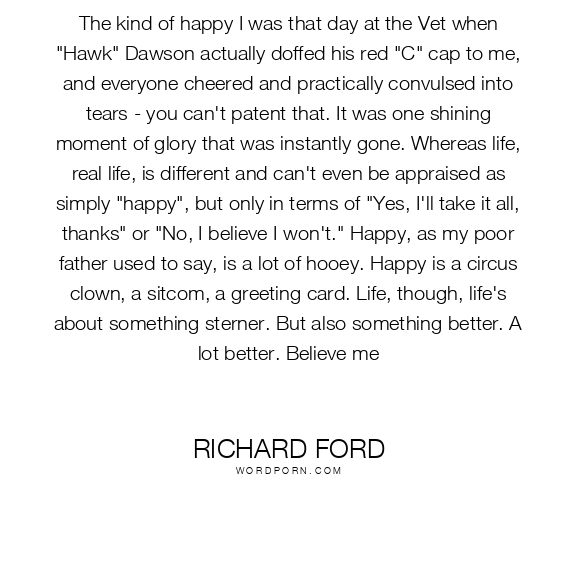 The kind of happy I was that day at the Vet when "Hawk" Dawson actually doffed his red "C" cap to me, and everyone cheered and practically convulsed into tears - you can't patent that. It was one shining moment of glory that was instantly gone. Whereas life, real life, is different and can't even be appraised as simply "happy", but only in terms of "Yes, I'll take it all, thanks" or "No, I believe I won't." Happy, as my poor father used to say, is a lot of hooey. Happy is a circus clown, a sitcom, a greeting card. Life, though, life's about something sterner. But also something better. A lot better. Believe me