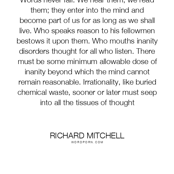 Words never fail. We hear them, we read them; they enter into the mind and become part of us for as long as we shall live. Who speaks reason to his fellowmen bestows it upon them. Who mouths inanity disorders thought for all who listen. There must be some minimum allowable dose of inanity beyond which the mind cannot remain reasonable. Irrationality, like buried chemical waste, sooner or later must seep into all the tissues of thought