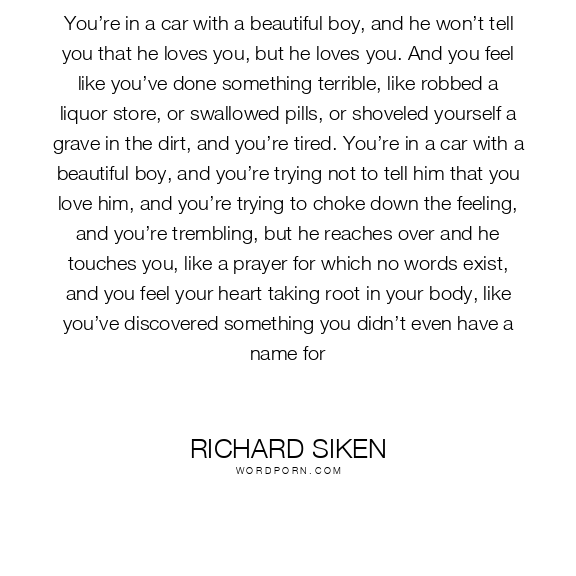 You’re in a car with a beautiful boy, and he won’t tell you that he loves you, but he loves you. And you feel like you’ve done something terrible, like robbed a liquor store, or swallowed pills, or shoveled yourself a grave in the dirt, and you’re tired. You’re in a car with a beautiful boy, and you’re trying not to tell him that you love him, and you’re trying to choke down the feeling, and you’re trembling, but he reaches over and he touches you, like a prayer for which no words exist, and you feel your heart taking root in your body, like you’ve discovered something you didn’t even have a name for