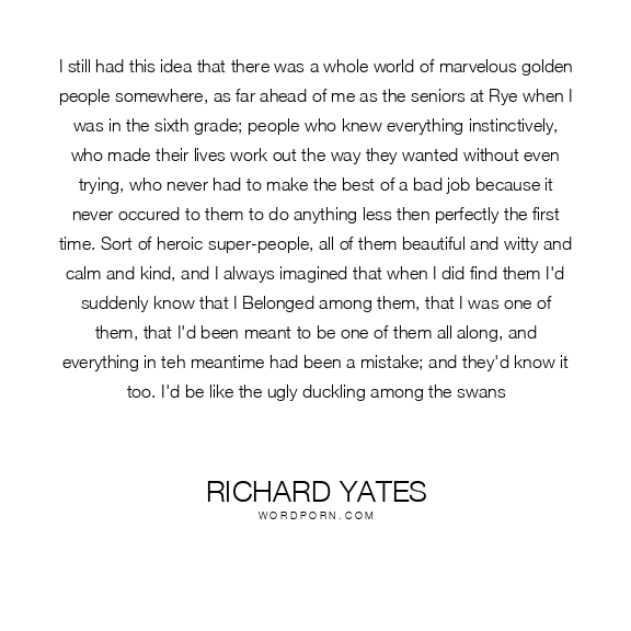 I still had this idea that there was a whole world of marvelous golden people somewhere, as far ahead of me as the seniors at Rye when I was in the sixth grade; people who knew everything instinctively, who made their lives work out the way they wanted without even trying, who never had to make the best of a bad job because it never occured to them to do anything less then perfectly the first time. Sort of heroic super-people, all of them beautiful and witty and calm and kind, and I always imagined that when I did find them I'd suddenly know that I Belonged among them, that I was one of them, that I'd been meant to be one of them all along, and everything in teh meantime had been a mistake; and they'd know it too. I'd be like the ugly duckling among the swans