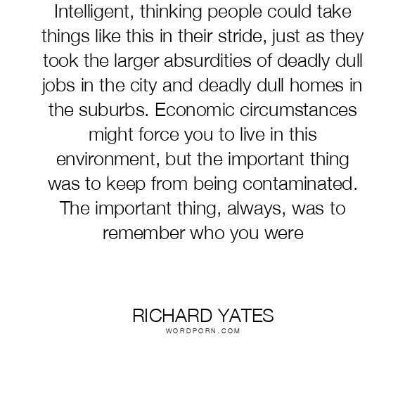 Intelligent, thinking people could take things like this in their stride, just as they took the larger absurdities of deadly dull jobs in the city and deadly dull homes in the suburbs. Economic circumstances might force you to live in this environment, but the important thing was to keep from being contaminated. The important thing, always, was to remember who you were