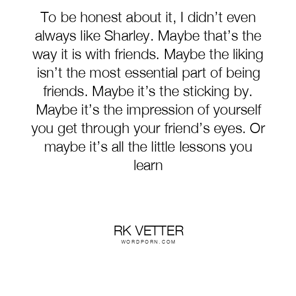 To be honest about it, I didn’t even always like Sharley. Maybe that’s the way it is with friends. Maybe the liking isn’t the most essential part of being friends. Maybe it’s the sticking by. Maybe it’s the impression of yourself you get through your friend’s eyes. Or maybe it’s all the little lessons you learn