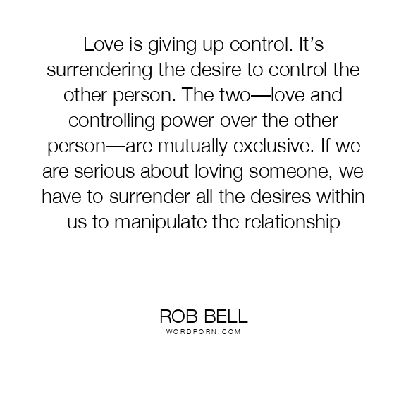 Love is giving up control. It’s surrendering the desire to control the other person. The two—love and controlling power over the other person—are mutually exclusive. If we are serious about loving someone, we have to surrender all the desires within us to manipulate the relationship