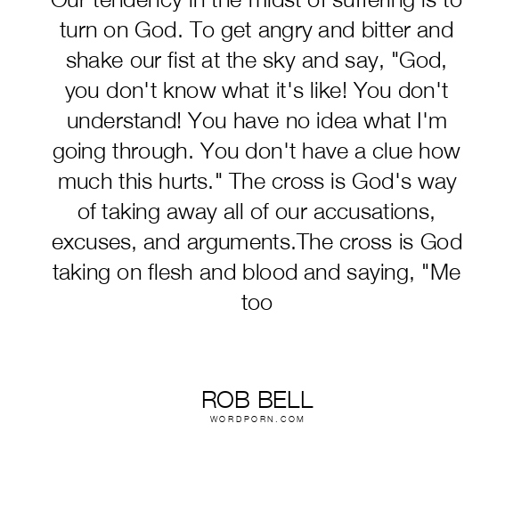 Our tendency in the midst of suffering is to turn on God. To get angry and bitter and shake our fist at the sky and say, "God, you don't know what it's like! You don't understand! You have no idea what I'm going through. You don't have a clue how much this hurts." The cross is God's way of taking away all of our accusations, excuses, and arguments.The cross is God taking on flesh and blood and saying, "Me too