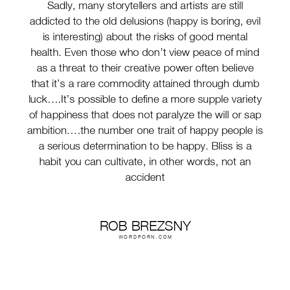 Sadly, many storytellers and artists are still addicted to the old delusions (happy is boring, evil is interesting) about the risks of good mental health. Even those who don’t view peace of mind as a threat to their creative power often believe that it’s a rare commodity attained through dumb luck….It’s possible to define a more supple variety of happiness that does not paralyze the will or sap ambition….the number one trait of happy people is a serious determination to be happy. Bliss is a habit you can cultivate, in other words, not an accident