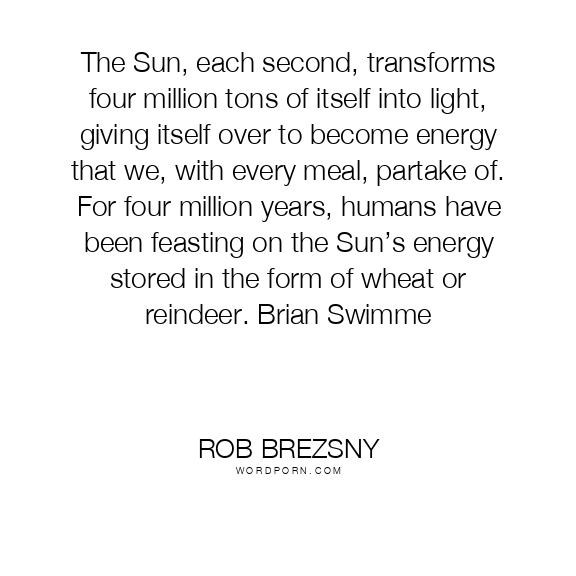The Sun, each second, transforms four million tons of itself into light, giving itself over to become energy that we, with every meal, partake of. For four million years, humans have been feasting on the Sun’s energy stored in the form of wheat or reindeer. Brian Swimme