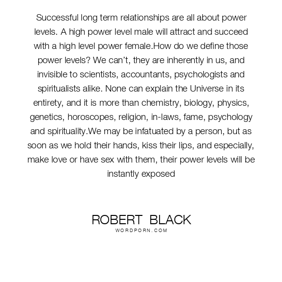 Successful long term relationships are all about power levels. A high power level male will attract and succeed with a high level power female.How do we define those power levels? We can’t, they are inherently in us, and invisible to scientists, accountants, psychologists and spiritualists alike. None can explain the Universe in its entirety, and it is more than chemistry, biology, physics, genetics, horoscopes, religion, in-laws, fame, psychology and spirituality.We may be infatuated by a person, but as soon as we hold their hands, kiss their lips, and especially, make love or have sex with them, their power levels will be instantly exposed