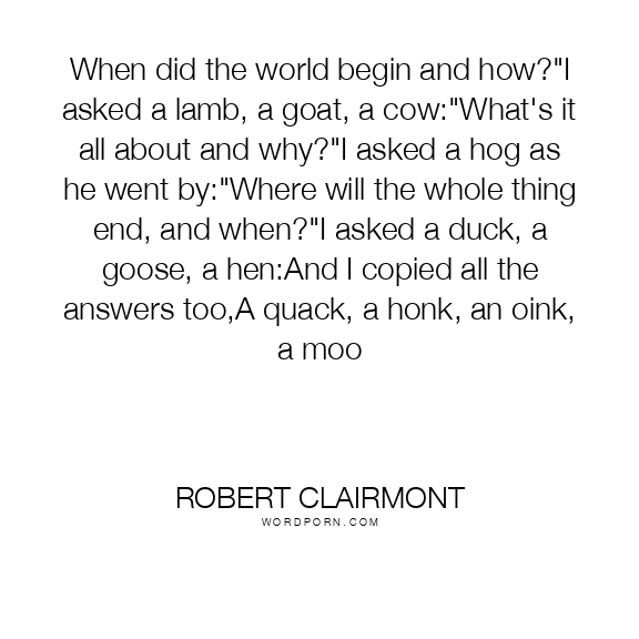 When did the world begin and how?"I asked a lamb, a goat, a cow:"What's it all about and why?"I asked a hog as he went by:"Where will the whole thing end, and when?"I asked a duck, a goose, a hen:And I copied all the answers too,A quack, a honk, an oink, a moo