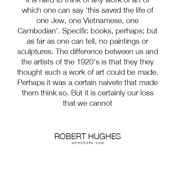 It is hard to think of any work of art of which one can say 'this saved the life of one Jew, one Vietnamese, one Cambodian'. Specific books, perhaps; but as far as one can tell, no paintings or sculptures. The difference between us and the artists of the 1920's is that they they thought such a work of art could be made. Perhaps it was a certain naivete that made them think so. But it is certainly our loss that we cannot