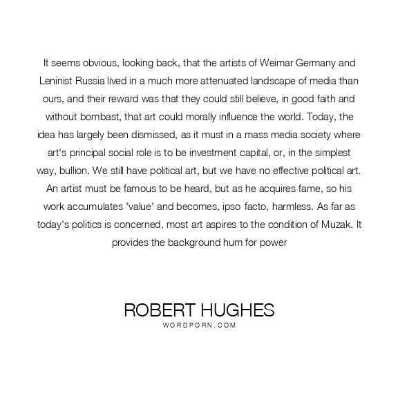 It seems obvious, looking back, that the artists of Weimar Germany and Leninist Russia lived in a much more attenuated landscape of media than ours, and their reward was that they could still believe, in good faith and without bombast, that art could morally influence the world. Today, the idea has largely been dismissed, as it must in a mass media society where art's principal social role is to be investment capital, or, in the simplest way, bullion. We still have political art, but we have no effective political art. An artist must be famous to be heard, but as he acquires fame, so his work accumulates 'value' and becomes, ipso-facto, harmless. As far as today's politics is concerned, most art aspires to the condition of Muzak. It provides the background hum for power