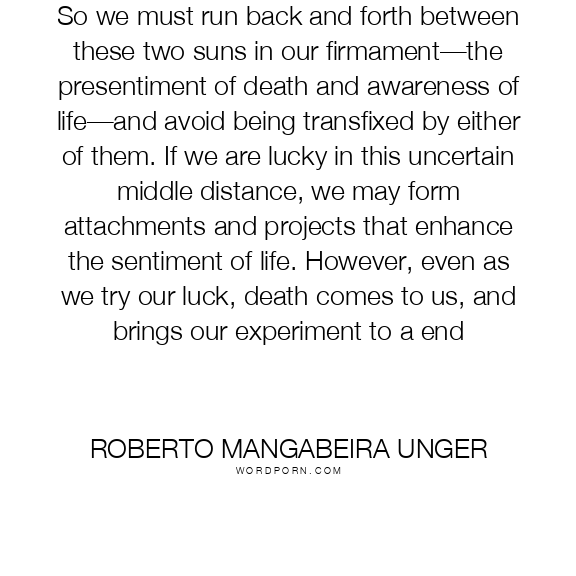 So we must run back and forth between these two suns in our firmament—the presentiment of death and awareness of life—and avoid being transfixed by either of them. If we are lucky in this uncertain middle distance, we may form attachments and projects that enhance the sentiment of life. However, even as we try our luck, death comes to us, and brings our experiment to a end