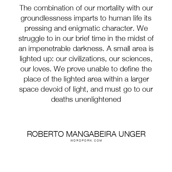 The combination of our mortality with our groundlessness imparts to human life its pressing and enigmatic character. We struggle to in our brief time in the midst of an impenetrable darkness. A small area is lighted up: our civilizations, our sciences, our loves. We prove unable to define the place of the lighted area within a larger space devoid of light, and must go to our deaths unenlightened