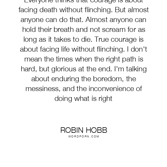 Everyone thinks that courage is about facing death without flinching. But almost anyone can do that. Almost anyone can hold their breath and not scream for as long as it takes to die. True courage is about facing life without flinching. I don't mean the times when the right path is hard, but glorious at the end. I'm talking about enduring the boredom, the messiness, and the inconvenience of doing what is right