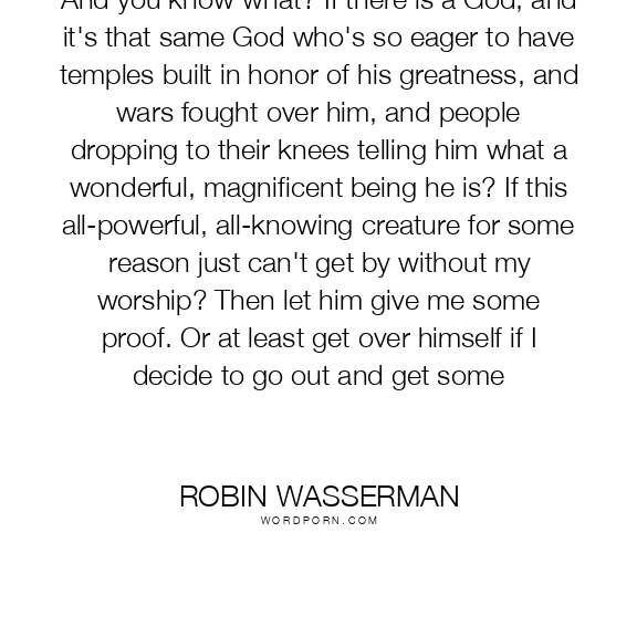 And you know what? If there is a God, and it's that same God who's so eager to have temples built in honor of his greatness, and wars fought over him, and people dropping to their knees telling him what a wonderful, magnificent being he is? If this all-powerful, all-knowing creature for some reason just can't get by without my worship? Then let him give me some proof. Or at least get over himself if I decide to go out and get some