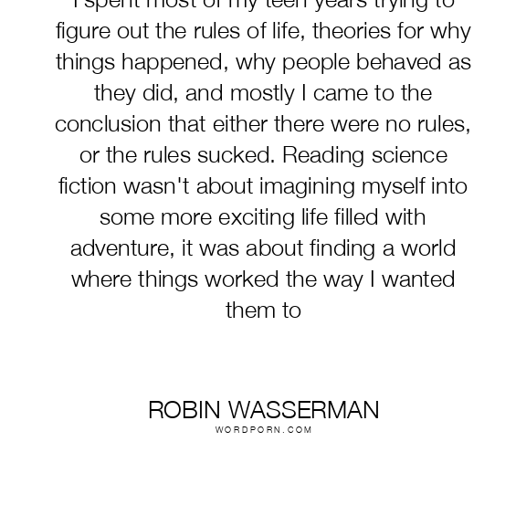 I spent most of my teen years trying to figure out the rules of life, theories for why things happened, why people behaved as they did, and mostly I came to the conclusion that either there were no rules, or the rules sucked. Reading science fiction wasn't about imagining myself into some more exciting life filled with adventure, it was about finding a world where things worked the way I wanted them to