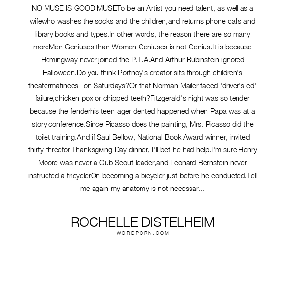 NO MUSE IS GOOD MUSETo be an Artist you need talent, as well as a wifewho washes the socks and the children,and returns phone calls and library books and types.In other words, the reason there are so many moreMen Geniuses than Women Geniuses is not Genius.It is because Hemingway never joined the P.T.A.And Arthur Rubinstein ignored Halloween.Do you think Portnoy's creator sits through children's theatermatinees--on Saturdays?Or that Norman Mailer faced 'driver's ed' failure,chicken pox or chipped teeth?Fitzgerald's night was so tender because the fenderhis teen-ager dented happened when Papa was at a story conference.Since Picasso does the painting, Mrs. Picasso did the toilet training.And if Saul Bellow, National Book Award winner, invited thirty-threefor Thanksgiving Day dinner, I'll bet he had help.I'm sure Henry Moore was never a Cub Scout leader,and Leonard Bernstein never instructed a tricyclerOn becoming a bicycler just before he conducted.Tell me again my anatomy is not necessarily my destiny,tell me my hang-up is a personal and not a universal quandary,and I'll tell you no muse is a good museunless she also helps with the laundry