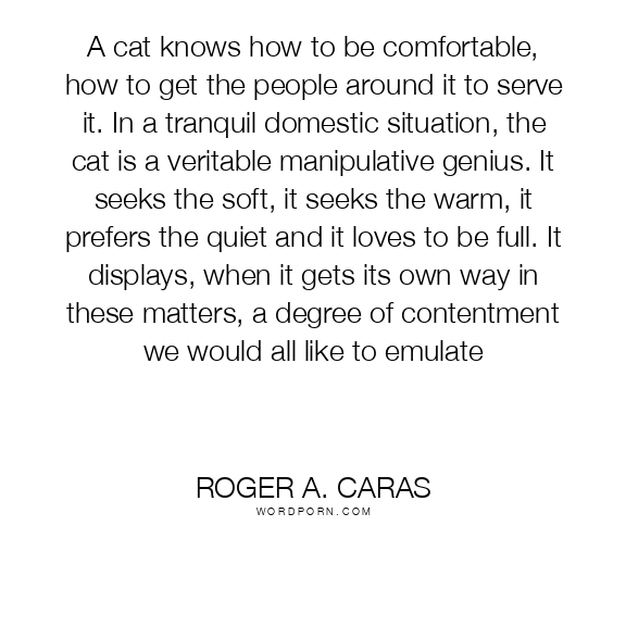 A cat knows how to be comfortable, how to get the people around it to serve it. In a tranquil domestic situation, the cat is a veritable manipulative genius. It seeks the soft, it seeks the warm, it prefers the quiet and it loves to be full. It displays, when it gets its own way in these matters, a degree of contentment we would all like to emulate