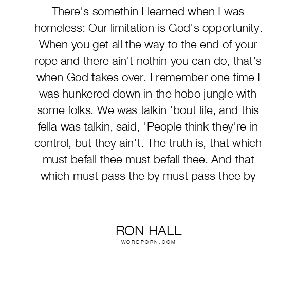 There's somethin I learned when I was homeless: Our limitation is God's opportunity. When you get all the way to the end of your rope and there ain't nothin you can do, that's when God takes over. I remember one time I was hunkered down in the hobo jungle with some folks. We was talkin 'bout life, and this fella was talkin, said, 'People think they're in control, but they ain't. The truth is, that which must befall thee must befall thee. And that which must pass the by must pass thee by