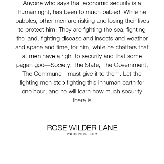 Anyone who says that economic security is a human right, has been to much babied. While he babbles, other men are risking and losing their lives to protect him. They are fighting the sea, fighting the land, fighting disease and insects and weather and space and time, for him, while he chatters that all men have a right to security and that some pagan god—Society, The State, The Government, The Commune—must give it to them. Let the fighting men stop fighting this inhuman earth for one hour, and he will learn how much security there is