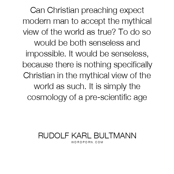 Can Christian preaching expect modern man to accept the mythical view of the world as true? To do so would be both senseless and impossible. It would be senseless, because there is nothing specifically Christian in the mythical view of the world as such. It is simply the cosmology of a pre-scientific age