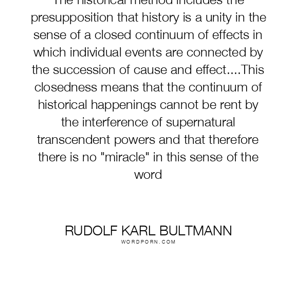 The historical method includes the presupposition that history is a unity in the sense of a closed continuum of effects in which individual events are connected by the succession of cause and effect....This closedness means that the continuum of historical happenings cannot be rent by the interference of supernatural transcendent powers and that therefore there is no "miracle" in this sense of the word