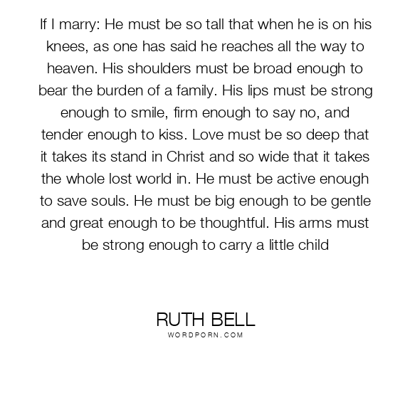 If I marry: He must be so tall that when he is on his knees, as one has said he reaches all the way to heaven. His shoulders must be broad enough to bear the burden of a family. His lips must be strong enough to smile, firm enough to say no, and tender enough to kiss. Love must be so deep that it takes its stand in Christ and so wide that it takes the whole lost world in. He must be active enough to save souls. He must be big enough to be gentle and great enough to be thoughtful. His arms must be strong enough to carry a little child