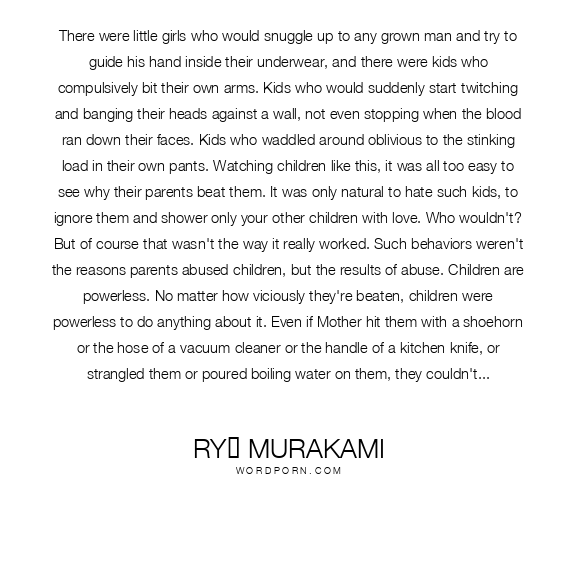 There were little girls who would snuggle up to any grown man and try to guide his hand inside their underwear, and there were kids who compulsively bit their own arms. Kids who would suddenly start twitching and banging their heads against a wall, not even stopping when the blood ran down their faces. Kids who waddled around oblivious to the stinking load in their own pants. Watching children like this, it was all too easy to see why their parents beat them. It was only natural to hate such kids, to ignore them and shower only your other children with love. Who wouldn't? But of course that wasn't the way it really worked. Such behaviors weren't the reasons parents abused children, but the results of abuse. Children are powerless. No matter how viciously they're beaten, children were powerless to do anything about it. Even if Mother hit them with a shoehorn or the hose of a vacuum cleaner or the handle of a kitchen knife, or strangled them or poured boiling water on them, they couldn't escape her; they couldn't even truly despise her. Children would struggle desperately to feel love for their parents. Rather than hate a parent, in fact, they'd choose to hate themselves. Love and violence became so intertwined for them that when they grew up and got into relationships, only hysteria could set their hearts at ease. Kindness, gentleness - anything along those lines just caused tension, since there was no telling when it would turn to overt hostility