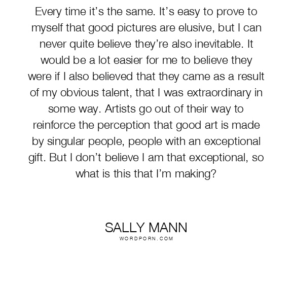 Every time it’s the same. It’s easy to prove to myself that good pictures are elusive, but I can never quite believe they’re also inevitable. It would be a lot easier for me to believe they were if I also believed that they came as a result of my obvious talent, that I was extraordinary in some way. Artists go out of their way to reinforce the perception that good art is made by singular people, people with an exceptional gift. But I don’t believe I am that exceptional, so what is this that I’m making?