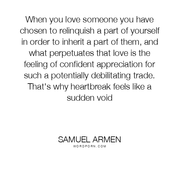 When you love someone you have chosen to relinquish a part of yourself in order to inherit a part of them, and what perpetuates that love is the feeling of confident appreciation for such a potentially debilitating trade. That's why heartbreak feels like a sudden void