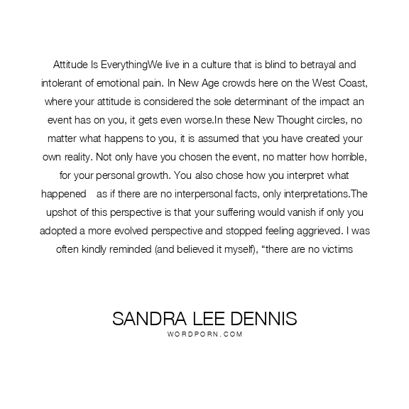 Attitude Is EverythingWe live in a culture that is blind to betrayal and intolerant of emotional pain. In New Age crowds here on the West Coast, where your attitude is considered the sole determinant of the impact an event has on you, it gets even worse.In these New Thought circles, no matter what happens to you, it is assumed that you have created your own reality. Not only have you chosen the event, no matter how horrible, for your personal growth. You also chose how you interpret what happened—as if there are no interpersonal facts, only interpretations.The upshot of this perspective is that your suffering would vanish if only you adopted a more evolved perspective and stopped feeling aggrieved. I was often kindly reminded (and believed it myself), “there are no victims