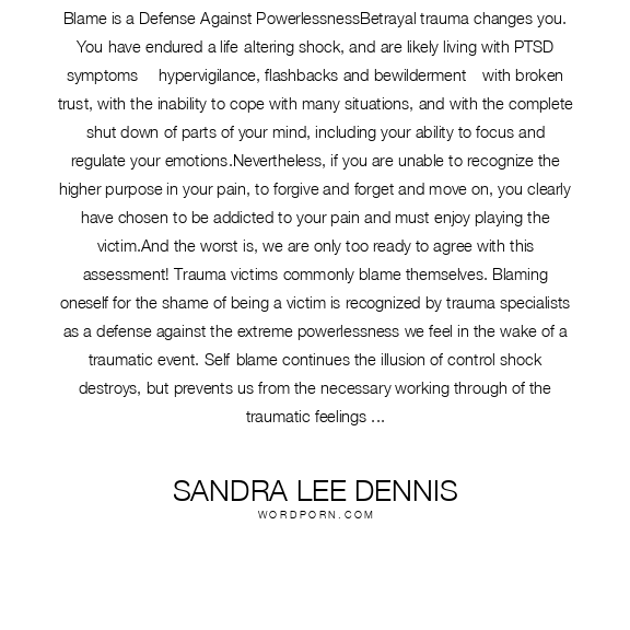Blame is a Defense Against PowerlessnessBetrayal trauma changes you. You have endured a life-altering shock, and are likely living with PTSD symptoms— hypervigilance, flashbacks and bewilderment—with broken trust, with the inability to cope with many situations, and with the complete shut down of parts of your mind, including your ability to focus and regulate your emotions.Nevertheless, if you are unable to recognize the higher purpose in your pain, to forgive and forget and move on, you clearly have chosen to be addicted to your pain and must enjoy playing the victim.And the worst is, we are only too ready to agree with this assessment! Trauma victims commonly blame themselves. Blaming oneself for the shame of being a victim is recognized by trauma specialists as a defense against the extreme powerlessness we feel in the wake of a traumatic event. Self-blame continues the illusion of control shock destroys, but prevents us from the necessary working through of the traumatic feelings and memories to heal and recover