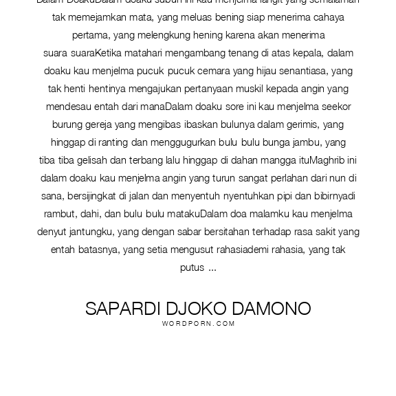 Dalam DoakuDalam doaku subuh ini kau menjelma langit yang semalaman tak memejamkan mata, yang meluas bening siap menerima cahaya pertama, yang melengkung hening karena akan menerima suara-suaraKetika matahari mengambang tenang di atas kepala, dalam doaku kau menjelma pucuk-pucuk cemara yang hijau senantiasa, yang tak henti-hentinya mengajukan pertanyaan muskil kepada angin yang mendesau entah dari manaDalam doaku sore ini kau menjelma seekor burung gereja yang mengibas-ibaskan bulunya dalam gerimis, yang hinggap di ranting dan menggugurkan bulu-bulu bunga jambu, yang tiba-tiba gelisah dan terbang lalu hinggap di dahan mangga ituMaghrib ini dalam doaku kau menjelma angin yang turun sangat perlahan dari nun di sana, bersijingkat di jalan dan menyentuh-nyentuhkan pipi dan bibirnyadi rambut, dahi, dan bulu-bulu matakuDalam doa malamku kau menjelma denyut jantungku, yang dengan sabar bersitahan terhadap rasa sakit yang entah batasnya, yang setia mengusut rahasiademi rahasia, yang tak putus-putusnya bernyanyi bagi kehidupankuAku mencintaimu..Itu sebabnya aku takkan pernah selesai mendoakan keselamatanmu(1989)