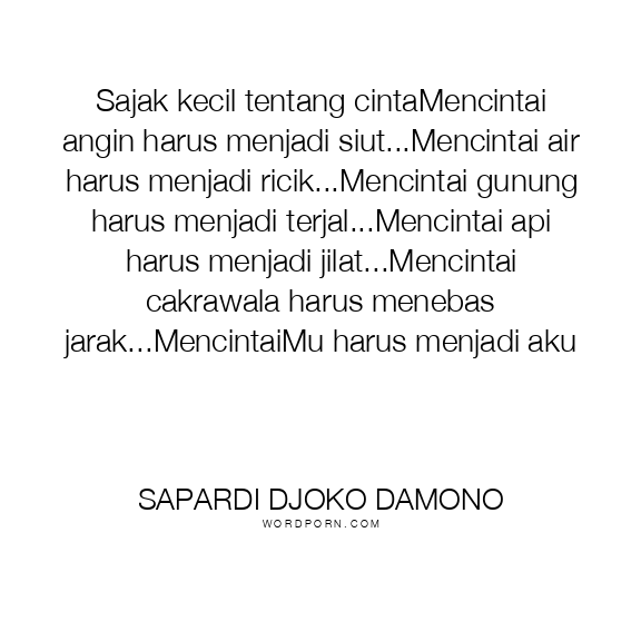 Sajak kecil tentang cintaMencintai angin harus menjadi siut...Mencintai air harus menjadi ricik...Mencintai gunung harus menjadi terjal...Mencintai api harus menjadi jilat...Mencintai cakrawala harus menebas jarak...MencintaiMu harus menjadi aku