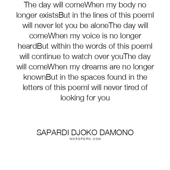 The day will comeWhen my body no longer existsBut in the lines of this poemI will never let you be aloneThe day will comeWhen my voice is no longer heardBut within the words of this poemI will continue to watch over youThe day will comeWhen my dreams are no longer knownBut in the spaces found in the letters of this poemI will never tired of looking for you