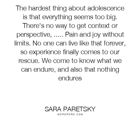 The hardest thing about adolescence is that everything seems too big. There's no way to get context or perspective, ..... Pain and joy without limits. No one can live like that forever, so experience finally comes to our rescue. We come to know what we can endure, and also that nothing endures