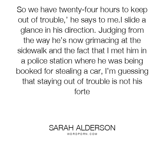So we have twenty-four hours to keep out of trouble,’ he says to me.I slide a glance in his direction. Judging from the way he’s now grimacing at the sidewalk and the fact that I met him in a police station where he was being booked for stealing a car, I’m guessing that staying out of trouble is not his forte