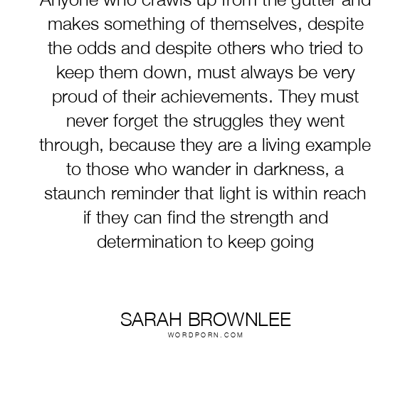 Anyone who crawls up from the gutter and makes something of themselves, despite the odds and despite others who tried to keep them down, must always be very proud of their achievements. They must never forget the struggles they went through, because they are a living example to those who wander in darkness, a staunch reminder that light is within reach if they can find the strength and determination to keep going