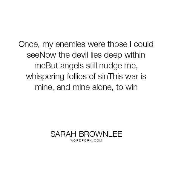 Once, my enemies were those I could seeNow the devil lies deep within meBut angels still nudge me, whispering follies of sinThis war is mine, and mine alone, to win