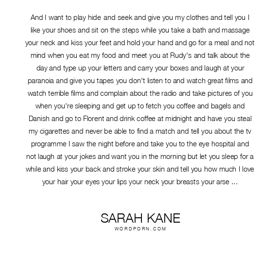 And I want to play hide-and-seek and give you my clothes and tell you I like your shoes and sit on the steps while you take a bath and massage your neck and kiss your feet and hold your hand and go for a meal and not mind when you eat my food and meet you at Rudy's and talk about the day and type up your letters and carry your boxes and laugh at your paranoia and give you tapes you don't listen to and watch great films and watch terrible films and complain about the radio and take pictures of you when you're sleeping and get up to fetch you coffee and bagels and Danish and go to Florent and drink coffee at midnight and have you steal my cigarettes and never be able to find a match and tell you about the tv programme I saw the night before and take you to the eye hospital and not laugh at your jokes and want you in the morning but let you sleep for a while and kiss your back and stroke your skin and tell you how much I love your hair your eyes your lips your neck your breasts your arse yourand sit on the steps smoking till your neighbour comes home and sit on the steps smoking till you come home and worry when you're late and be amazed when you're early and give you sunflowers and go to your party and dance till I'm black and be sorry when I'm wrong and happy when you forgive me and look at your photos and wish I'd known you forever and hear your voice in my ear and feel your skin on my skin and get scared when you're angry and your eye has gone red and the other eye blue and your hair to the left and your face oriental and tell you you're gorgeous and hug you when you're anxious and hold you when you hurt and want you when I smell you and offend you when I touch you and whimper when I'm next to you and whimper when I'm not and dribble on your breast and smother you in the night and get cold when you take the blanket and hot when you don't and melt when you smile and dissolve when you laugh and not understand why you think I'm rejecting you when I'm not rejecting you and wonder how you could think I'd ever reject you and wonder who you are but accept you anyway and tell you about the tree angel enchanted forest boy who flew across the ocean because he loved you and write poems for you and wonder why you don't believe me and have a feeling so deep I can't find words for it and want to buy you a kitten I'd get jealous of because it would get more attention than me and keep you in bed when you have to go and cry like a baby when you finally do and get rid of the roaches and buy you presents you don't want and take them away again and ask you to marry me and you say no again but keep on asking because though you think I don't mean it I do always have from the first time I asked you and wander the city thinking it's empty without you and want what you want and think I'm losing myself but know I'm safe with you and tell you the worst of me and try to give you the best of me because you don't deserve any less and answer your questions when I'd rather not and tell you the truth when I really don't want to and try to be honest because I know you prefer it and think it's all over but hang on in for just ten more minutes before you throw me out of your life and forget who I am and try to get closer to you because it's beautiful learning to know you and well worth the effort and speak German to you badly and Hebrew to you worse and make love with you at three in the morning and somehow somehow somehow communicate some of the overwhelming undying overpowering unconditional all-encompassing heart-enriching mind-expanding on-going never-ending love I have for you
