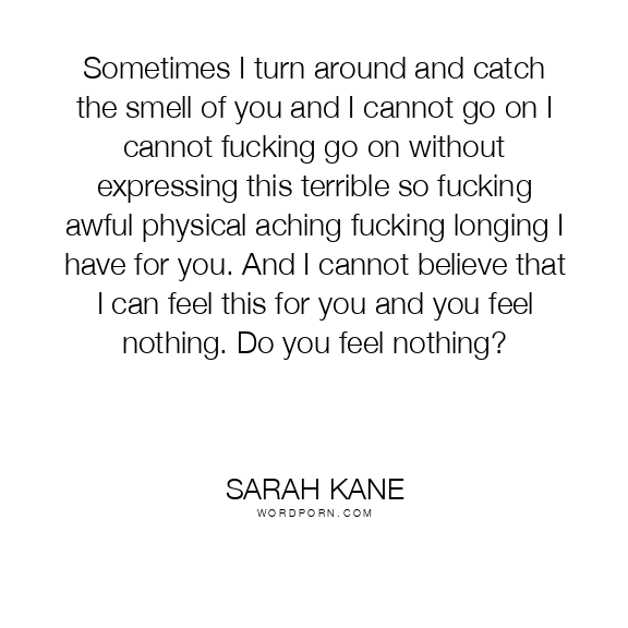 Sometimes I turn around and catch the smell of you and I cannot go on I cannot fucking go on without expressing this terrible so fucking awful physical aching fucking longing I have for you. And I cannot believe that I can feel this for you and you feel nothing. Do you feel nothing?