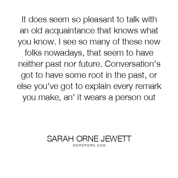 It does seem so pleasant to talk with an old acquaintance that knows what you know. I see so many of these new folks nowadays, that seem to have neither past nor future. Conversation's got to have some root in the past, or else you've got to explain every remark you make, an' it wears a person out