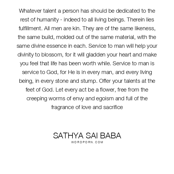 Whatever talent a person has should be dedicated to the rest of humanity - indeed to all living beings. Therein lies fulfillment. All men are kin. They are of the same likeness, the same build, molded out of the same material, with the same divine essence in each. Service to man will help your divinity to blossom, for it will gladden your heart and make you feel that life has been worth while. Service to man is service to God, for He is in every man, and every living being, in every stone and stump. Offer your talents at the feet of God. Let every act be a flower, free from the creeping worms of envy and egoism and full of the fragrance of love and sacrifice